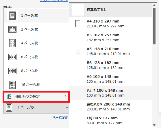3.[用紙サイズの指定]にポイントすると用紙サイズの一覧が出るので、希望の用紙サイズを選択する。