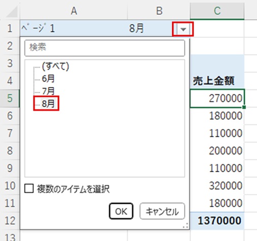 シートごとに確認したいときは、ページフィールドの下向き三角から選択します。