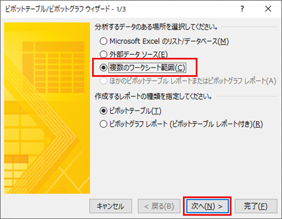 複数シートのピボットテーブルを作るときは、ピボットテーブルウィザードを使います。