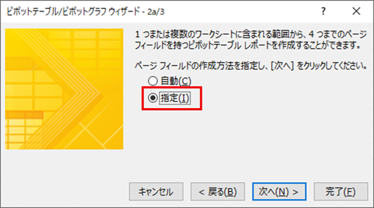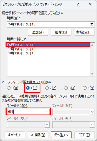 範囲一覧の1つ目を選択し、「ページフィールド数を指定してください。」にある「1(1)」を選択します。