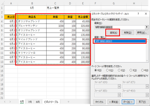 1つめのシートでピボットテーブルの範囲選択をし、[追加]をクリックすると「範囲一覧」に表示されます。