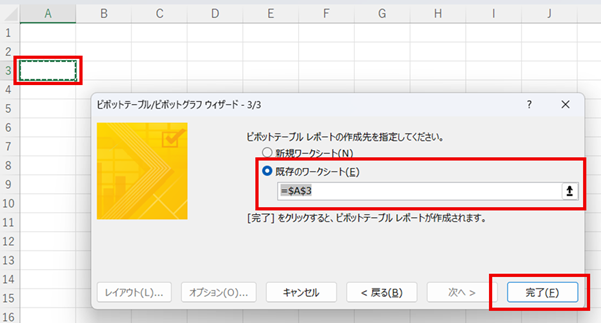 「完了」をクリックすると既存のワークシートが選択されていることを確認し、ピボットテーブルの開始位置のセル[$A$3]が選択されていますが、そのまま「完了」をクリックします。