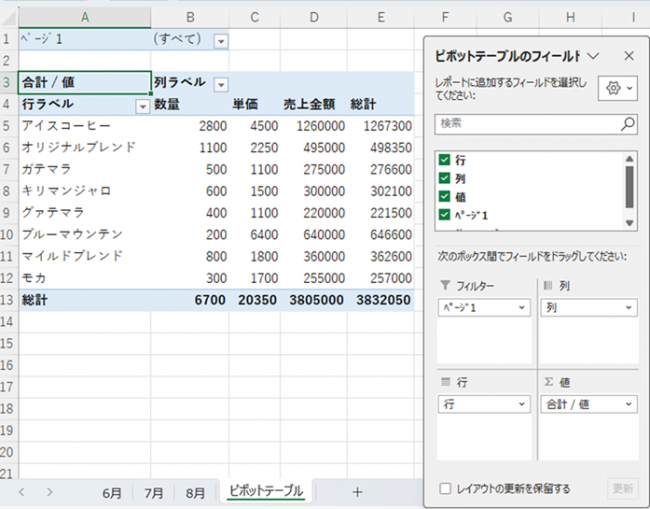行、列、値、ページフィルターは自動で作成されます。ピボットテーブルの「総計」は単なる数値と単価の合計になっているので非表示にします。