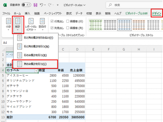 総計の項目を非表示にするには、「デザイン」タブの「総計」から「列のみ集計を行う」をクリックします。
