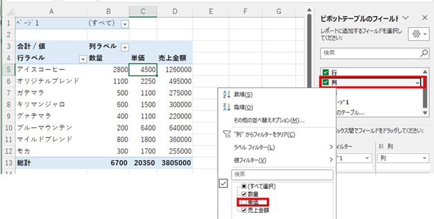 「列」の下向き矢印をクリックし、「単価」のチェックをはずします。