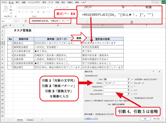 このように、REGEXREPLACE関数を使えば、引き継ぎメモやタスク管理表の備考欄を一括で整形できます。