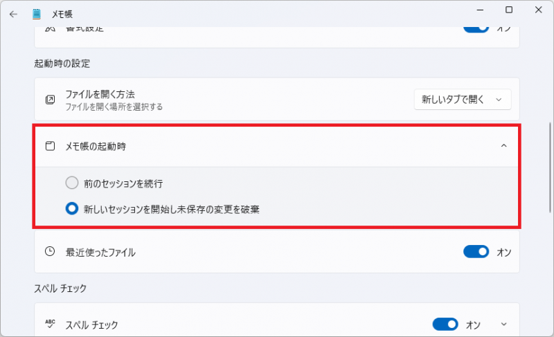 2.「起動時の設定」にある「メモ帳の起動時」をクリックし、ラジオボタンを「新しいセッションを開始し未保存の変更を破棄」にする