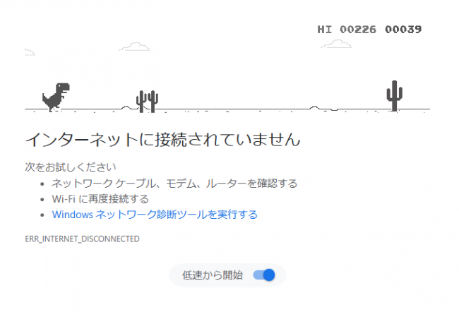 ネットワークの接続不良などで「インターネットに接続できません」という表示が出る事があります。このありがたくない表示ですが、ブラウザがChromeの場合、実はミニゲームが楽しめます。試してみたい方はローカルエリア接続などのネットワークアダプタを無効にすれば体験できます。画面が表示されたらスペースキーを押すと恐竜が走り出しますので、サボテン?をジャンプして超えるというシンプルなゲームです。
