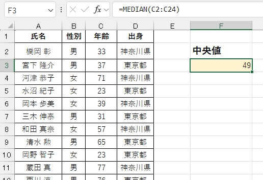 今回は年齢の中央値のため、最年少もしくは最年長から順番に並べると『49歳』が真ん中になることがわかります。