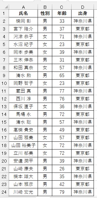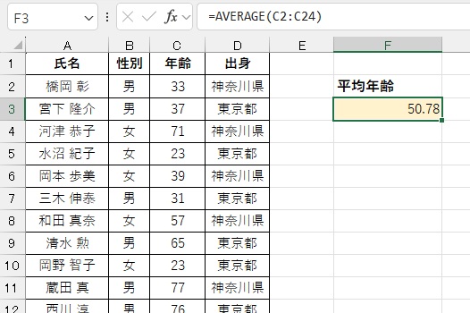 今回は条件を絞らず平均値を求めましたが、『男性』の平均年齢や、『東京都出身の女性の平均年齢』など、