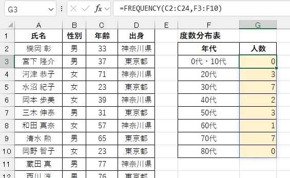 Excelでは、【FREQUENCY(フリークエンシー)関数】で求めます。引数には(データ配列,区間配列)を指定します。