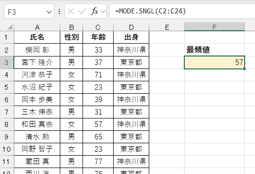 『年齢』列にて最も多いのは『57』歳ということがわかります。