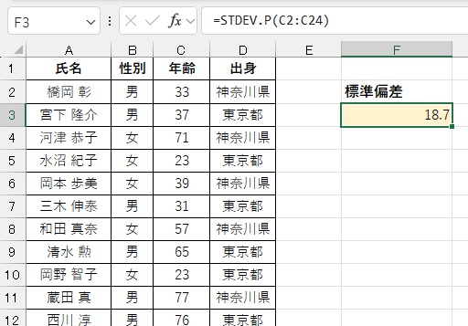 平均年齢から『18.7』のばらつきがあるということが解かります。