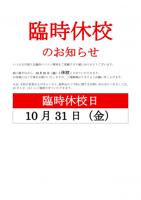 誠に勝手ながら、10月31日(金)を休校とさせていただきます。