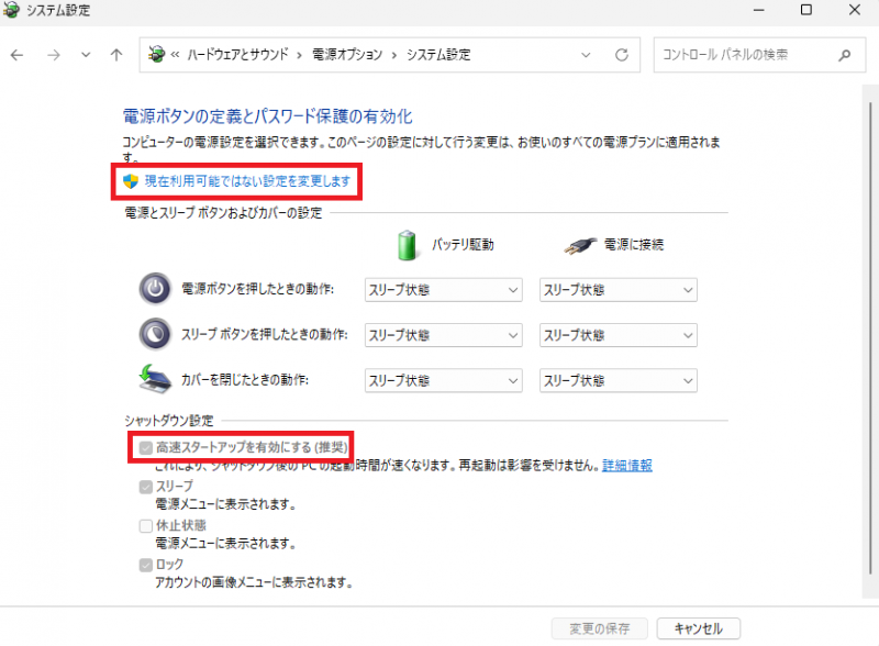 現在利用可能ではない設定を変更しますをクリックして高速スタートアップを有効にするのチェックを外します。