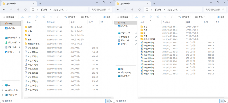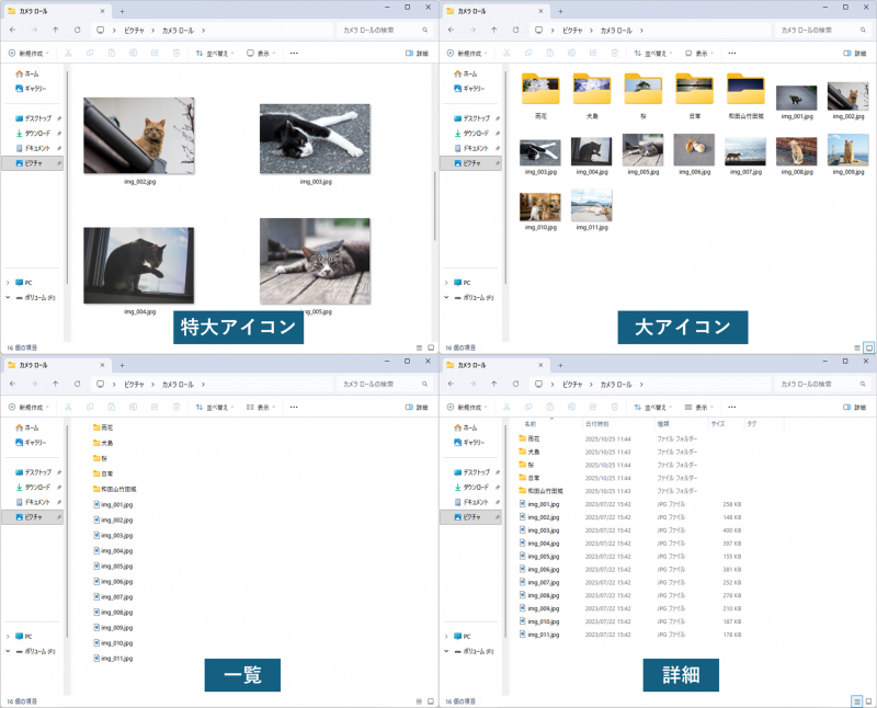 写真などのファイルをサムネイルで見たければ「特大アイコン」や「大アイコン」、たくさんあるファイルを一目で確認したい場合は「一覧」や「詳細」にすることで、表示を切り替えられます。