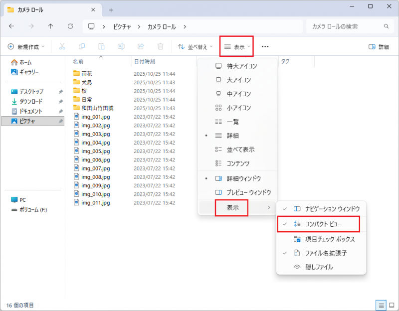 この設定はエクスプローラーの「コンパクトビュー」によって変更可能で、手順は以下のとおりです。