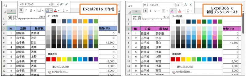Excel2016で作った表をExcel365の新規ファイルに貼り付けたところ、色が青からピンクになってしまったというケースです。