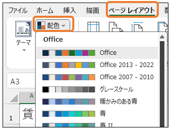 これは、色設定時に用意されているパレットの「テーマの色(配色)」 が関係しています。