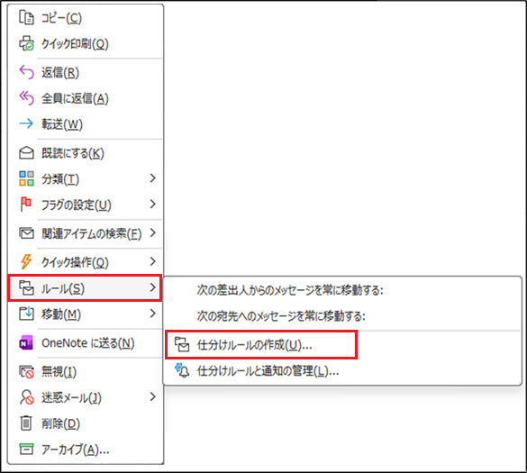 手順の一つ目は、該当メール上で右クリックし「ルール」→「仕分けルールの作成」を選択します。