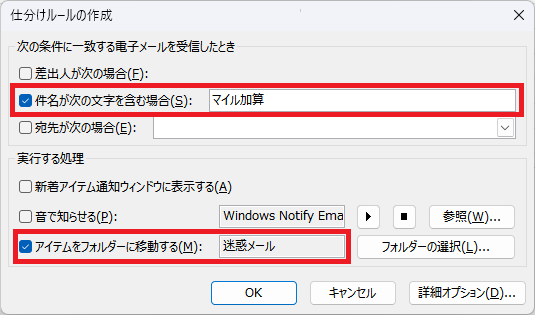 すると、下画像のような設定ウィンドウが開くので、「件名が次の文字を含む場合」の欄に、排除したい単語が入力されている状態にして、一番下は迷惑フォルダなどの隔離用のフォルダにします。