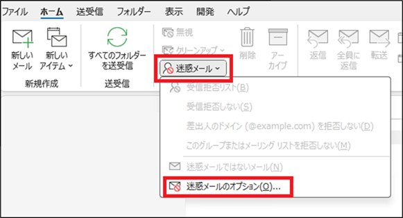 1.「ホーム」タブにある「迷惑メール」→「迷惑メールのオプション」をクリックしましょう。