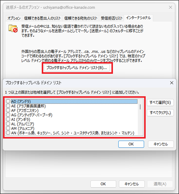 2.開いたウィンドウから「ブロックするトップレベルドメインリスト」をクリックし、リストの中からチェックして「OK」を選択しましょう。