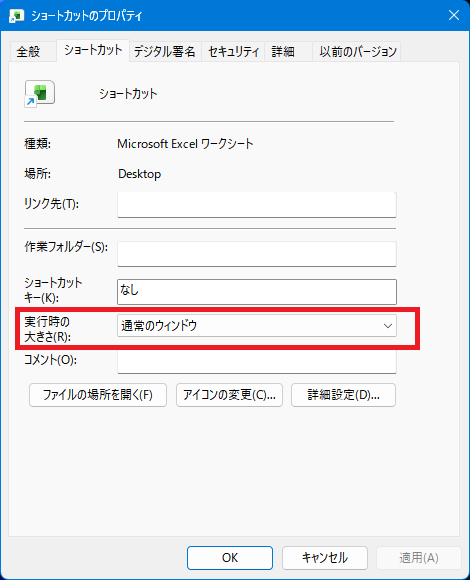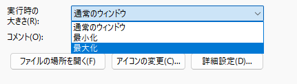 2.プロパティが開いたら、「実行時の大きさ」より「最大化」または「最小化」を選択しOKボタンをクリック。