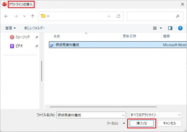 ③ 【アウトラインの挿入】ダイアログボックスが表示されますので、挿入するファイルを選択します