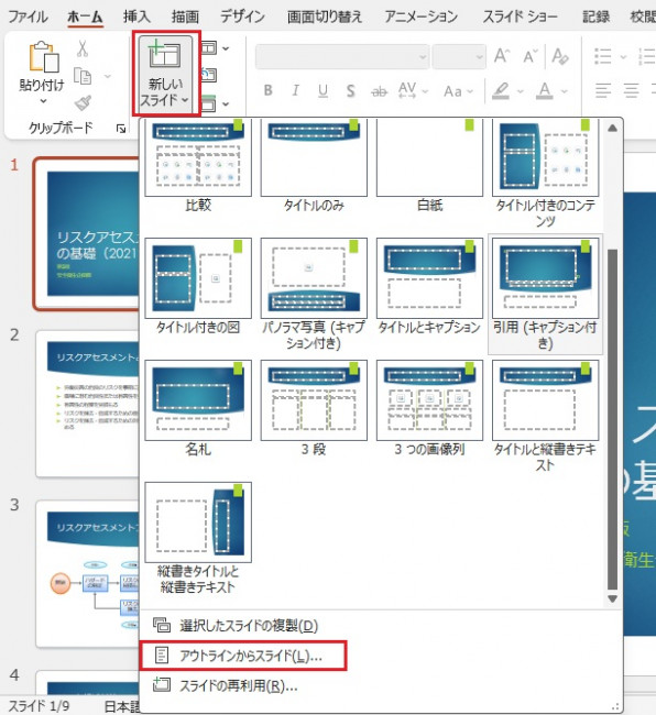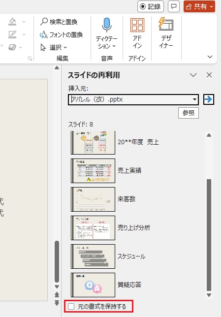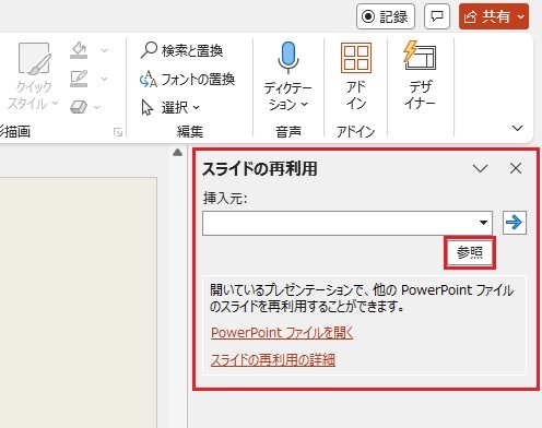 ③ 【スライドの再利用】作業ウィンドウが画面右側に表示されます