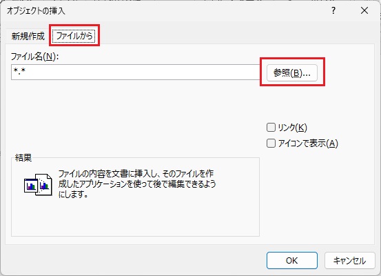 ② 【オブジェクトの挿入】ダイアログボックスが表示されますので、【ファイルから】タブを選択します