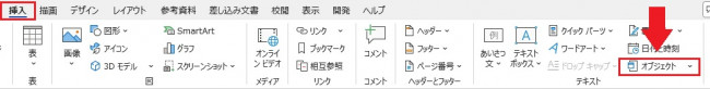 ① 【挿入】タブ→【テキスト】グループの【オブジェクト】を選択します