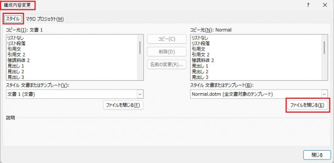 ⑤ 右側の【スタイル文書またはテンプレート】の【ファイルを閉じる】をクリックします