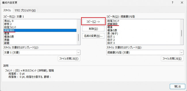 ⑦ 【構成内容変更】ダイアログボックスに戻りますので、右側の一覧からコピーする【スタイル】を選択します