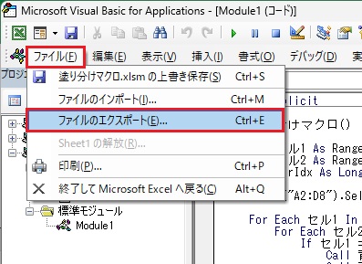 マクロをブック間でコピーする場合は、元データ(モジュール)をエクスポートして独立させた後に、エクスポートしたファイルを作業中ブックにインポートする流れとなります。