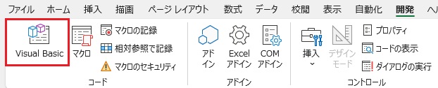 ② 【開発】タブ→【コード】グループの【Visual Basic】をクリックします
