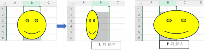 ●図形のある位置で列を削除または挿入すると列幅に合わせて変形します。