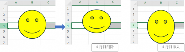 図形のある位置で行列に挿入、削除をしたとき図形は移動も変形もしません。