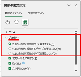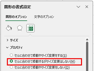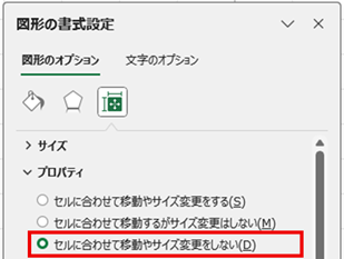 以上の3通りの設定がありますが、変形しない、移動させたくないときには、3つ目の「セルに合わせて移動やサイズ変更をしない」がおすすめです。