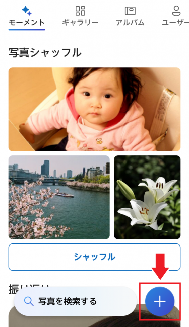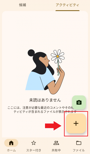 アプリを起動して、画面右下の【+(プラス)】ボタンをタップします。