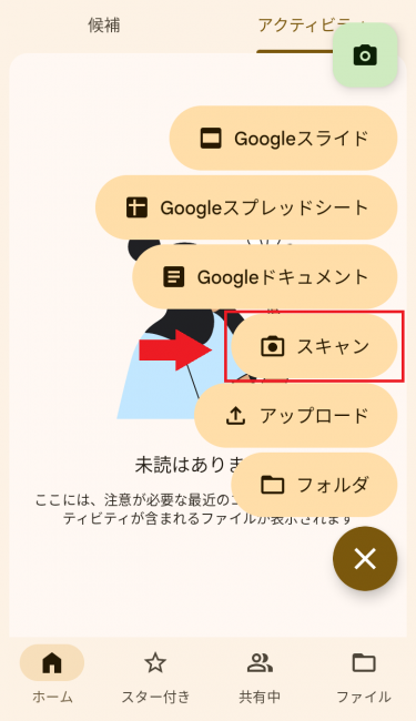 そうすると、追加方法の一覧が表示されますので、この中から【スキャン】をタップし、対象の書類を撮影します。