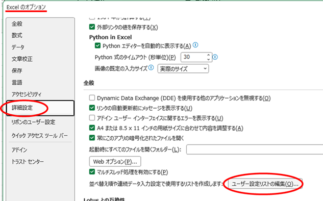 2.「ファイル」から「オプション」の「詳細設定」から「ユーザー設定リストの編集」を選択します。