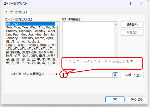 「リストの取り込み元範囲」のテキストボックスをクリックし、カーソルがあることを確認します。