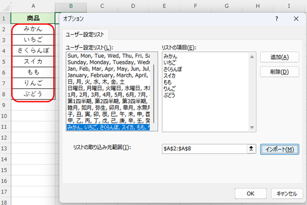 4.「1.」で作成したリストを範囲選択し、「インポート」→「OK」をクリックしてリストを取り込みます。