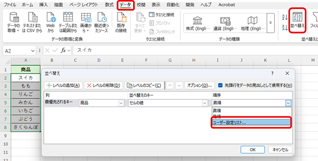 最優先されるキー(並べ替えをする項目)を選択→順序から「ユーザー設定リスト」を選択します。
