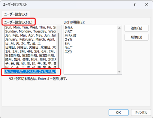 6.「ユーザー設定リスト」の一番下に追加されているリストを選択し「OK」をクリックします。