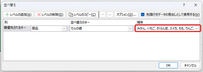 7.並べ替えの順序を確認して「OK」をクリックします。