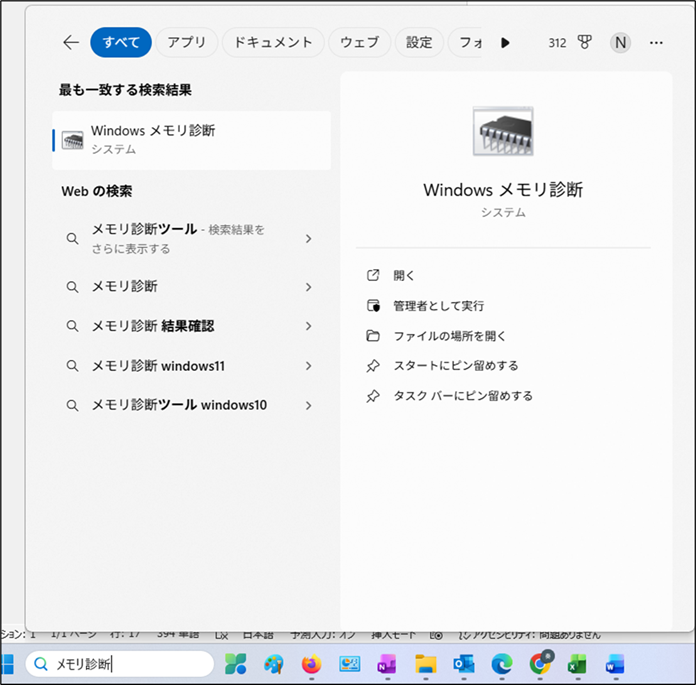 操作自体は単純で、まずはタスクバーの検索ボックスに「メモリ」や「メモリ診断」と入力すると「Windowsメモリ診断」と表示されます。