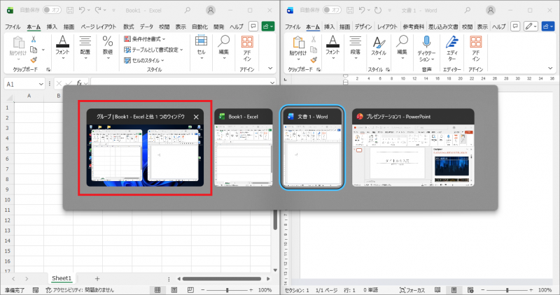 下の参考画像では、WordとExcelを左右で並べて表示させたため、左側に候補の一つとして表示されています。