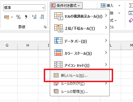 2.ホームタブ条件付き書式から「新しいルール」をクリック。